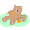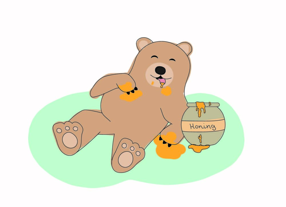 Een tevreden beer liggend in het gras die zichzelf heeft vol gegeten met honing. Een ansichtkaart om te gebruiken naar wens.